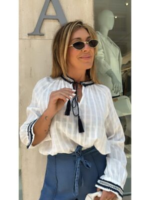 Blusa blanca boho con cuello pico con cordón y puños rebite marino