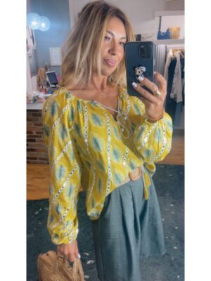 Blusa bobo amarilla con hojas verdes y espejitos