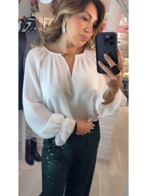 Blusa gasa blanca con detalle frontal dorado en cuello manga abullonada