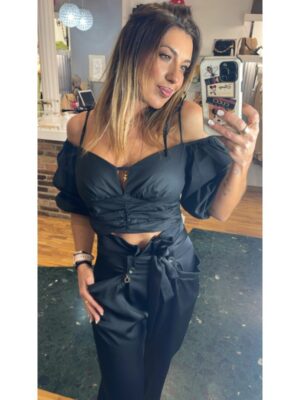 Blusa relish negro manga 3/4 abullonada con tirantes y escote corazón
