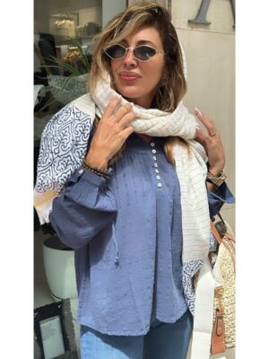 Blusa tiffosi boho algodón azul con textura cierre frontal con botones manga larga mod. alfama