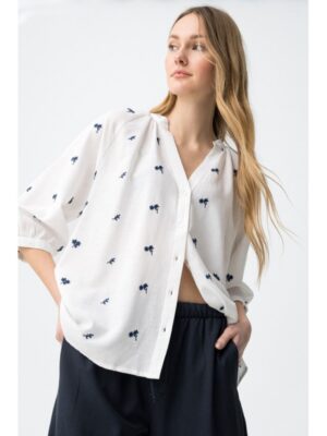 Camisa tiffosi blanca holgada con bordados azules cuello mao mod. edesta
