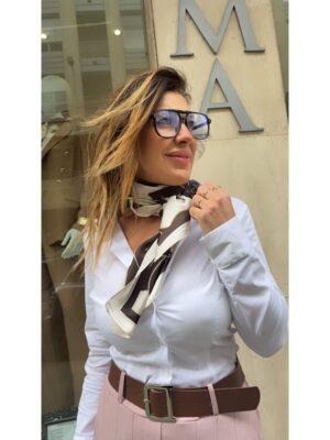 Camisa blanca semi transparente cuello camisero y detalle de pañuelo estampado con broche