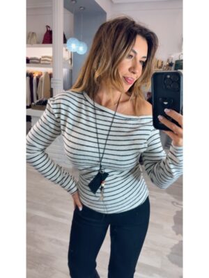 Camiseta en punto manga larga color blanco con raya negra asimétrica