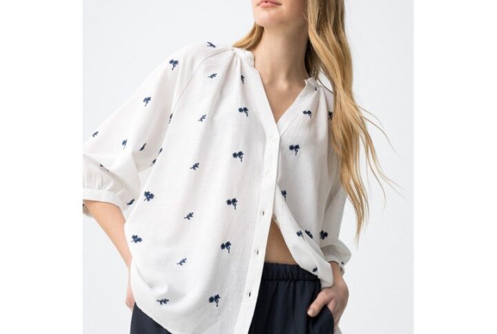 Camisa tiffosi blanca holgada con bordados azules cuello mao mod. edesta