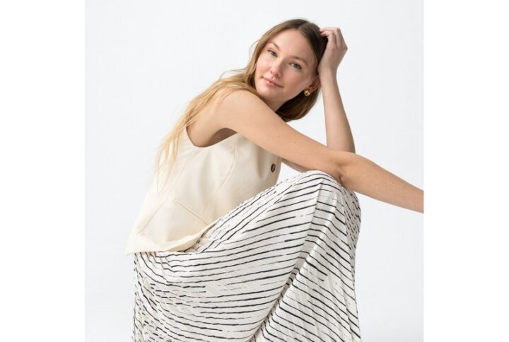Vestido tiffosi beige en dos piezas chaleco con botones y falda midi plisada con rayas negro mod. finca