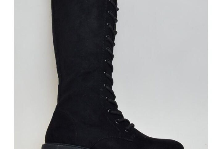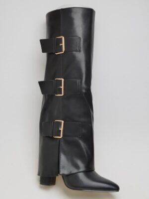 Bota caña alta negro hebillas oro con faldón sobre tacón