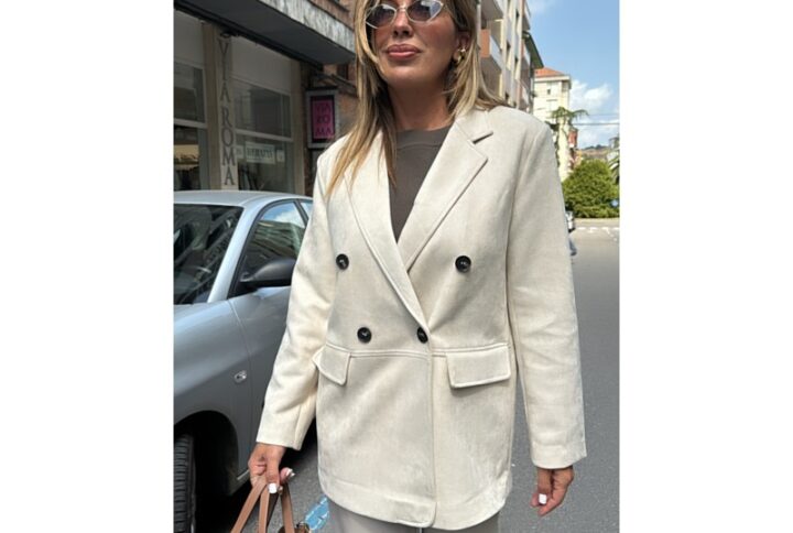 Chaleco punto morgan beige ajustado cuello redondo y flores de croché en frontal mod. mfleur